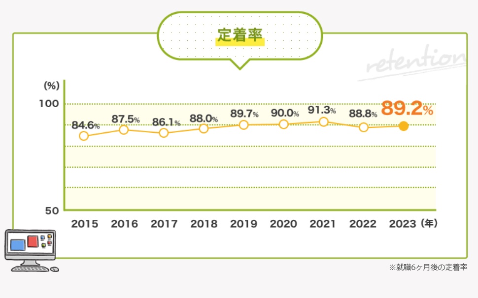 就職後の半年定着率は96%以上となっており、企業の戦力となる人材を育てていきます。